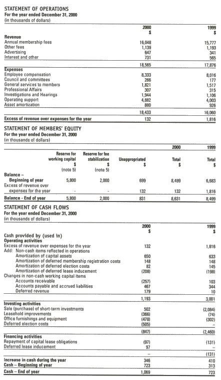 NOTES TO FINANCIAL STATEMENT As of December 31, 2000 (tabular amounts in thousands of dollars) 1) Ontario College of Teachers’ mandate The Ontario College of Teachers (the College) was established by an Act of the Ontario Legislature, which was proclaimed on July 5, 1996. The College is an independent, self-regulating professional body with authority to license and regulate the practice of teaching in Ontario. The affairs of the College are managed and administered by a Council comprised of 31 members, of whom 17 are members elected by the membership. 2) Summary of significant accounting policies The financial statements of the College have been prepared in accordance with Canadian generally accepted accounting principles. The more significant aspects are: Deferred election costs Council elections are normally held every three years. The cost of conducting these elections is deferred and amortized over the term of the elected members. Deferred membership registration costs To establish an initial registry of members, the College launched a campaign to acquire names and addresses of Ontario teachers and validated eligibility against the Ministry of Education records. This initial cost is being amortized over six years, commencing in 1997. Capital assets Capital assets are recorded at historical cost and are amortized on a straight-line basis over their estimated useful lives, as follows: Computer equipment................................................33-1/3% per annum Furniture and office equipment....................................10% per annum Leasehold improvements............................................over the remaining term of the lease Deferred lease inducements As described in note 6, the College is amortizing the lease inducements over the term of the respective leases. Not-for-profit As a not-for-profit professional membership organization, the College is not liable for income taxes. Fair value of financial instruments The carrying amounts of cash, short-term investments, accounts receivable, accounts payable and accrued liabilities approximate their fair values because of the near-term maturity of these instruments. 3) Capital assets