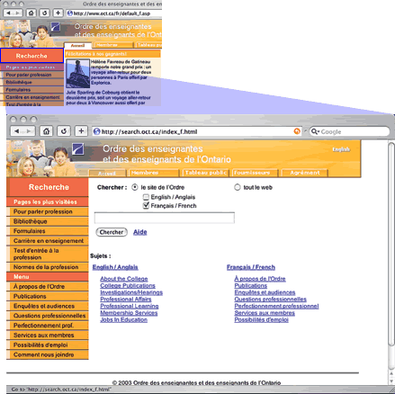 Pour une recherche presto! La prochaine fois que vous consulterez le site de l'Ordre, faites l'essai de sa nouvelle fonction de recherche située tout en haut dans le menu de gauche. Simple, rapide, elle vous permet de chercher de l'information en français, en anglais ou les deux à la fois et de vous servir des mêmes mots-clés pour naviguer dans Internet sans quitter la page de recherche du site. Une page d'aide vous donne des conseils, des exemples et des façons de préciser votre recherche. Un guide de syntaxe indique dans quel ordre les mots-clés doivent apparaître pour rendre la recherche la plus efficace possible. Résultat : une recherche illico presto!