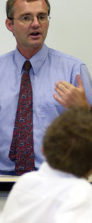 He moves around the class, never still or silent, questioning students in