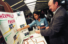 Student Vijeetha Raviraj and Paul Nicholls, a teacher at Weston Collegiate Institute were, among the 63 students and 11 teachers who participated in OSClub’s hands-on science, mathematics and technology projects during the fall and winter along with mentors from Lucent Technologies, Atomic Energy of Canada, Glaxo-Wellcome, M.D.Robotics, the Lunenfeld Research Institute and the Ontario Science Centre. For more information about next year’s OSClub, visit www.geocities.com/edm.rm/osclub.html. |